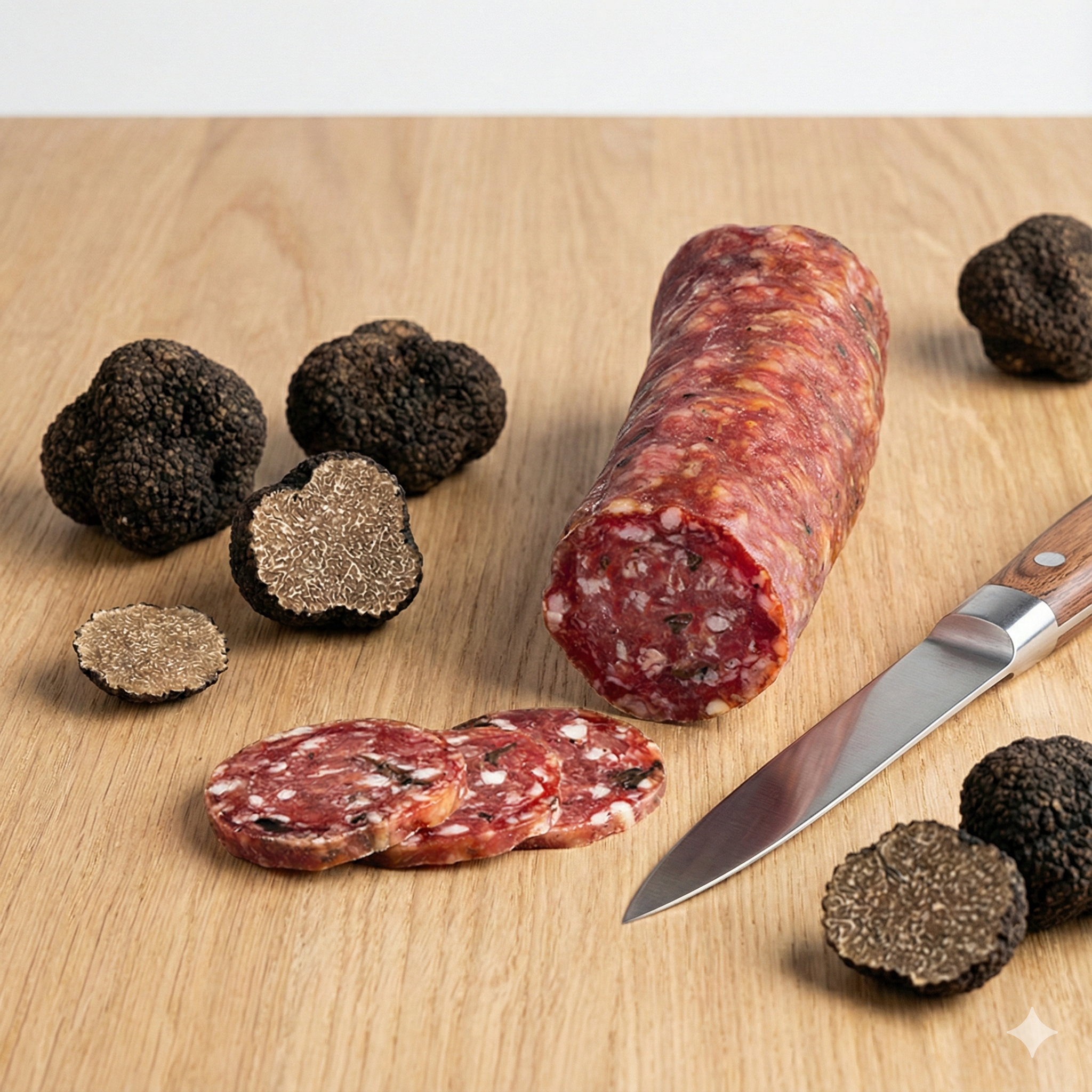 Indulge in the luxurious marriage of traditional French charcuterie and earthy Périgord truffle. This premium saucisson delivers rich, savory notes with delicate truffle undertones that elevate any charcuterie board or casual gathering. Sliced thin and paired with crusty bread, aged cheese, or enjoyed on its own, it's a sophisticated yet approachable way to experience gourmet French flavors. Perfect for those who appreciate the finer things without taking themselves too seriously.