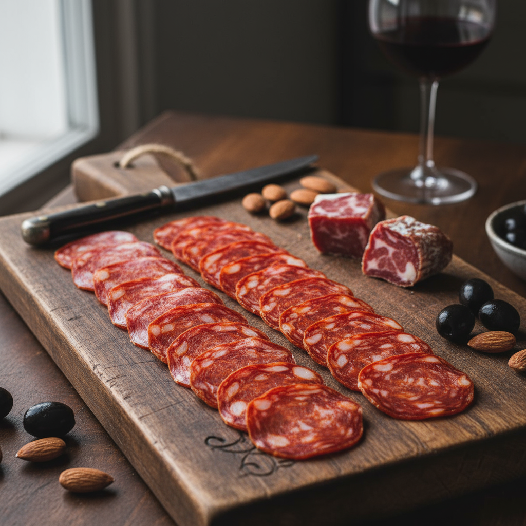 An excellent Iberian Acorn-fed Chorizo that is intense on the palate and pleasant to the smell. It is slowly cured and has a vivid colour characteristic of first-rate leans.